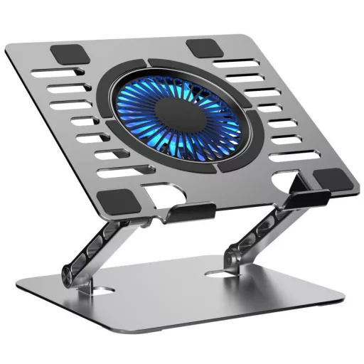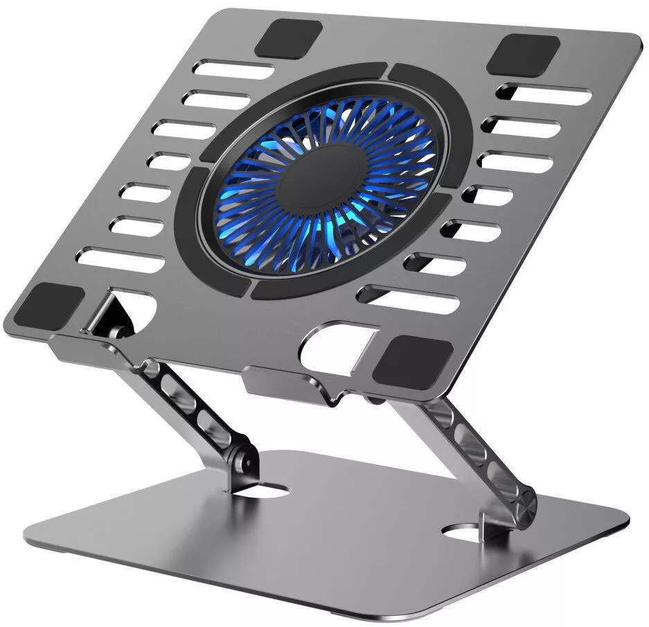 Az állvány alumíniumból készült, amely hatékonyan vezeti el a hőt és növeli a szerkezet tartósságát. A beépített ventilátor segít a laptop hűtésében, ami stabilabb működést eredményez.