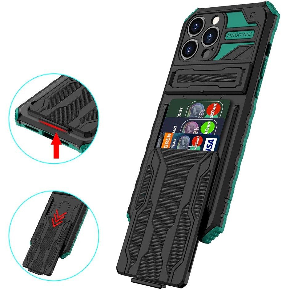 Apple iPhone 13 Pro Max, Műanyag hátlap védőtok szilikon belső, közepesen ütésálló, kitámasztóval, kártyatartóval, Wooze Transformer, fekete/zöld