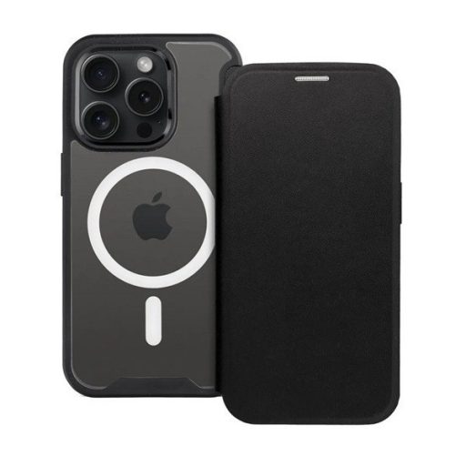 Apple iPhone 13 Pro Max, Oldalra nyíló tok, kártyatartóval, átlátszó hátlap, Magsafe kompatibilis, Smart Mag, fekete