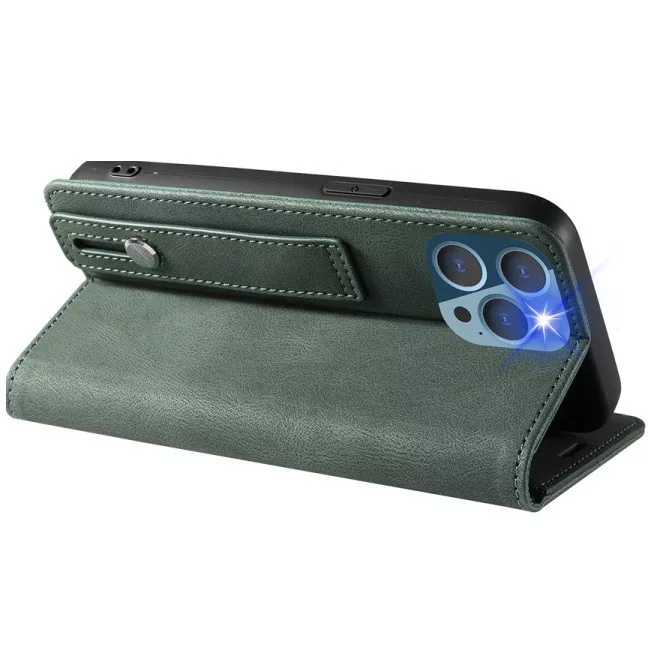 Apple iPhone 14 Pro Max, Oldalra nyíló tok, stand, kártyatartóval, kézpánttal, Wooze Business Plus, sötétzöld