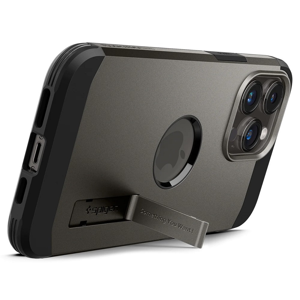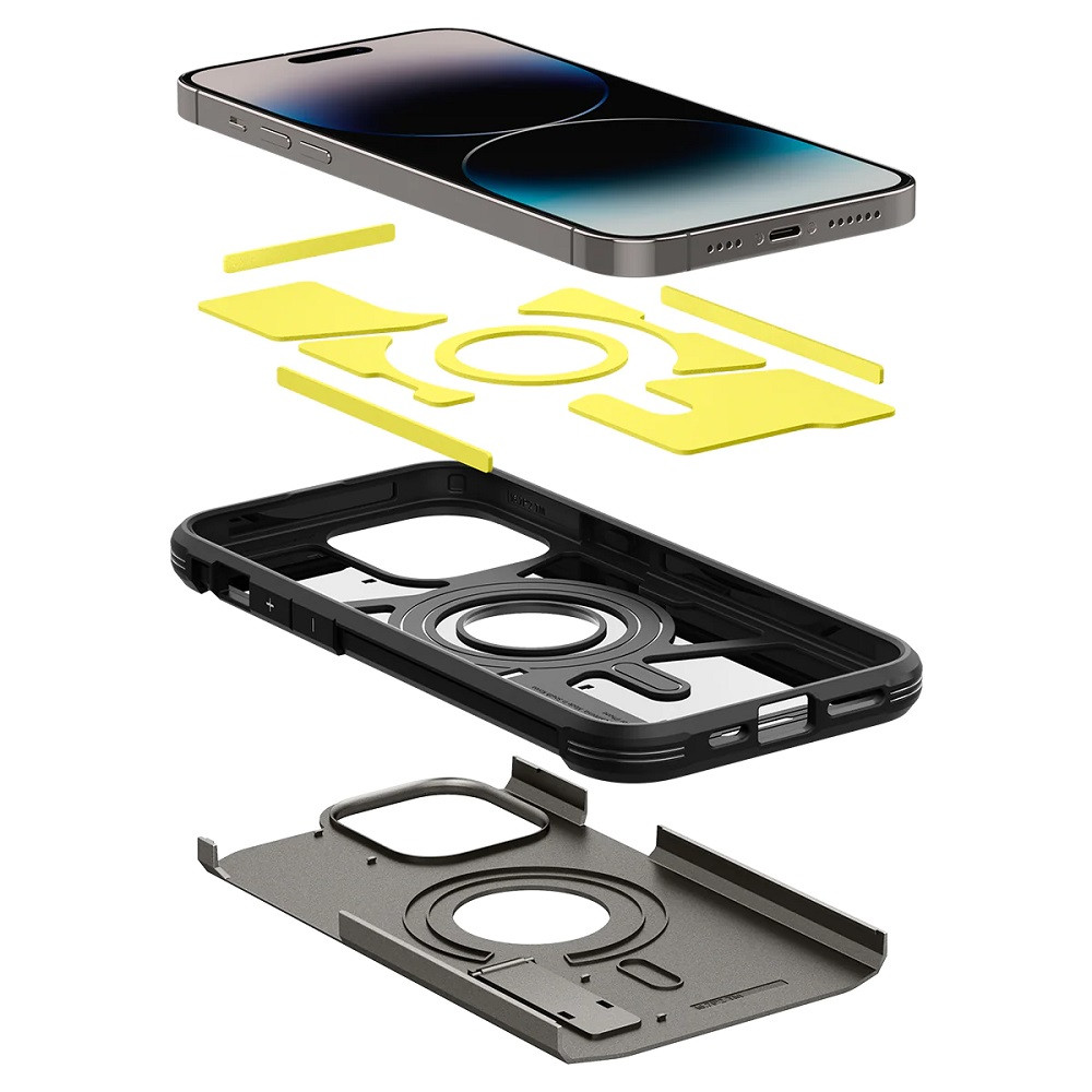 Apple iPhone 14 Pro, Szilikon tok + műanyag hátlap, Magsafe töltővel kompatibilis, kitámasztóval, Spigen Tough Armor Mag, sötétszürke részletes leírása