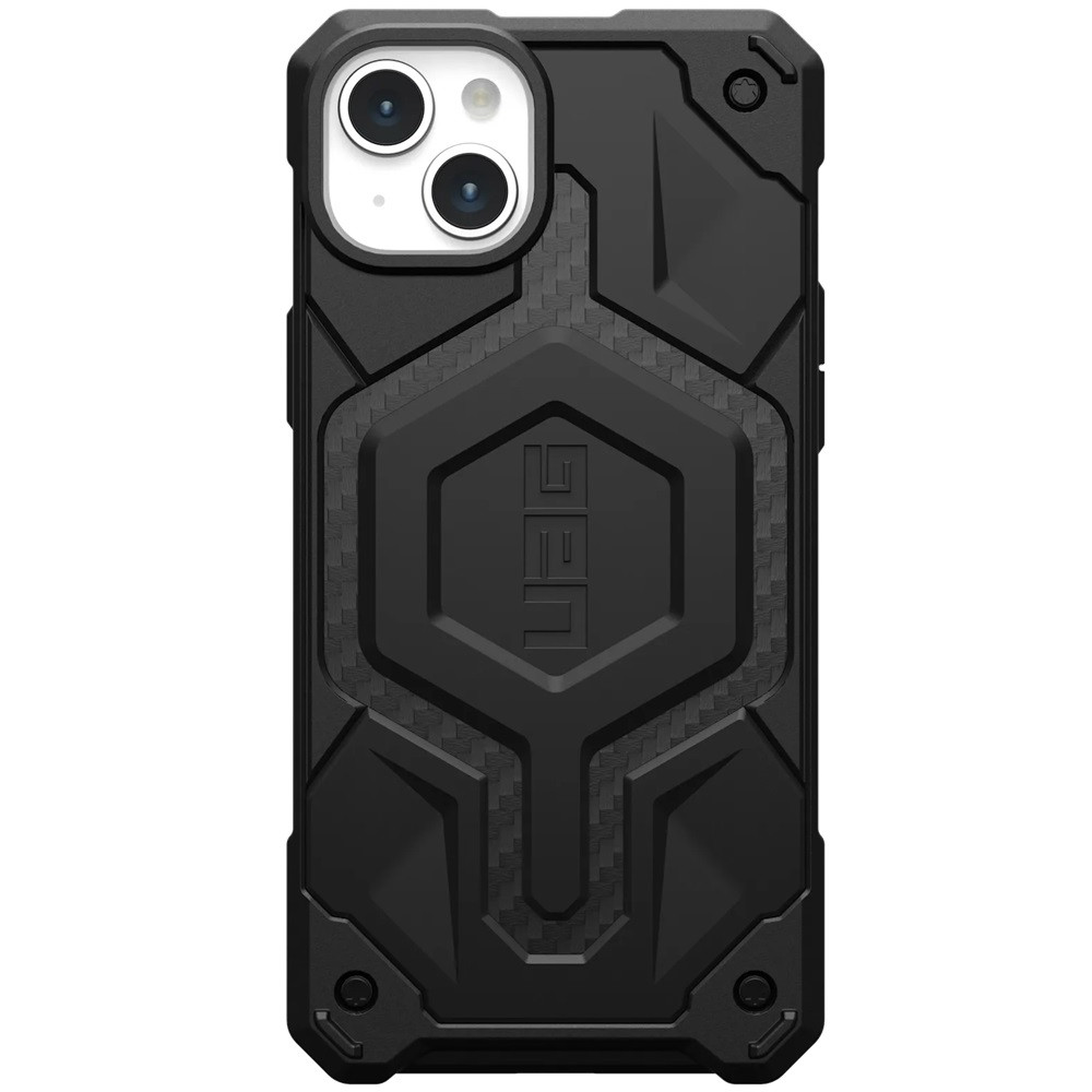 Vélemények Apple iPhone 15 Plus, Műanyag hátlap védőtok, szilikon belső, közepesen ütésálló, Magsafe töltővel kompatibilis, karbon minta, UAG Monarch Pro, mintás/fekete