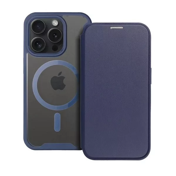 Apple iPhone 15 Pro Max, Oldalra nyíló tok, kártyatartóval, átlátszó hátlap, Magsafe kompatibilis, Smart Mag, sötétkék