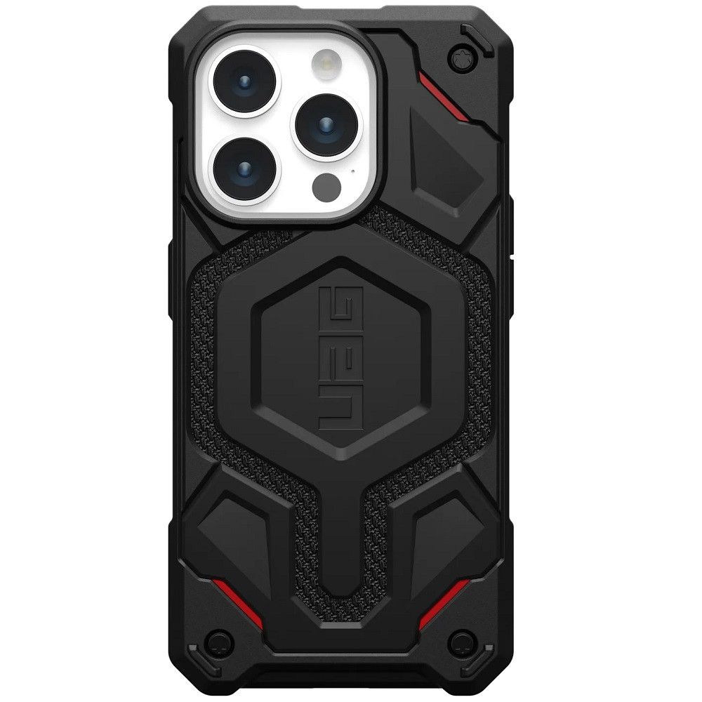 Apple iPhone 15 Pro, Műanyag hátlap védőtok, szilikon belső, közepesen ütésálló, Magsafe töltővel kompatibilis, textil minta, kevlár borítás, UAG Monarch Pro Kevlar, mintás/fekete részletes leírása
