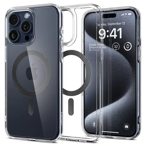 Apple iPhone 15 Pro, Műanyag hátlap védőtok + szilikon keret, Magsafe töltővel kompatibilis, karbon minta, Spigen Ultra Hybrid Mag, átlátszó/mintás