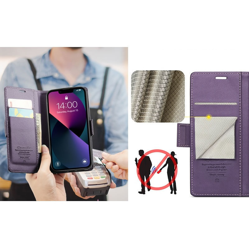 Apple iPhone 16 Plus, Oldalra nyíló tok, stand, kártyatartóval, RFID technológiával, Wooze CaseME, lila