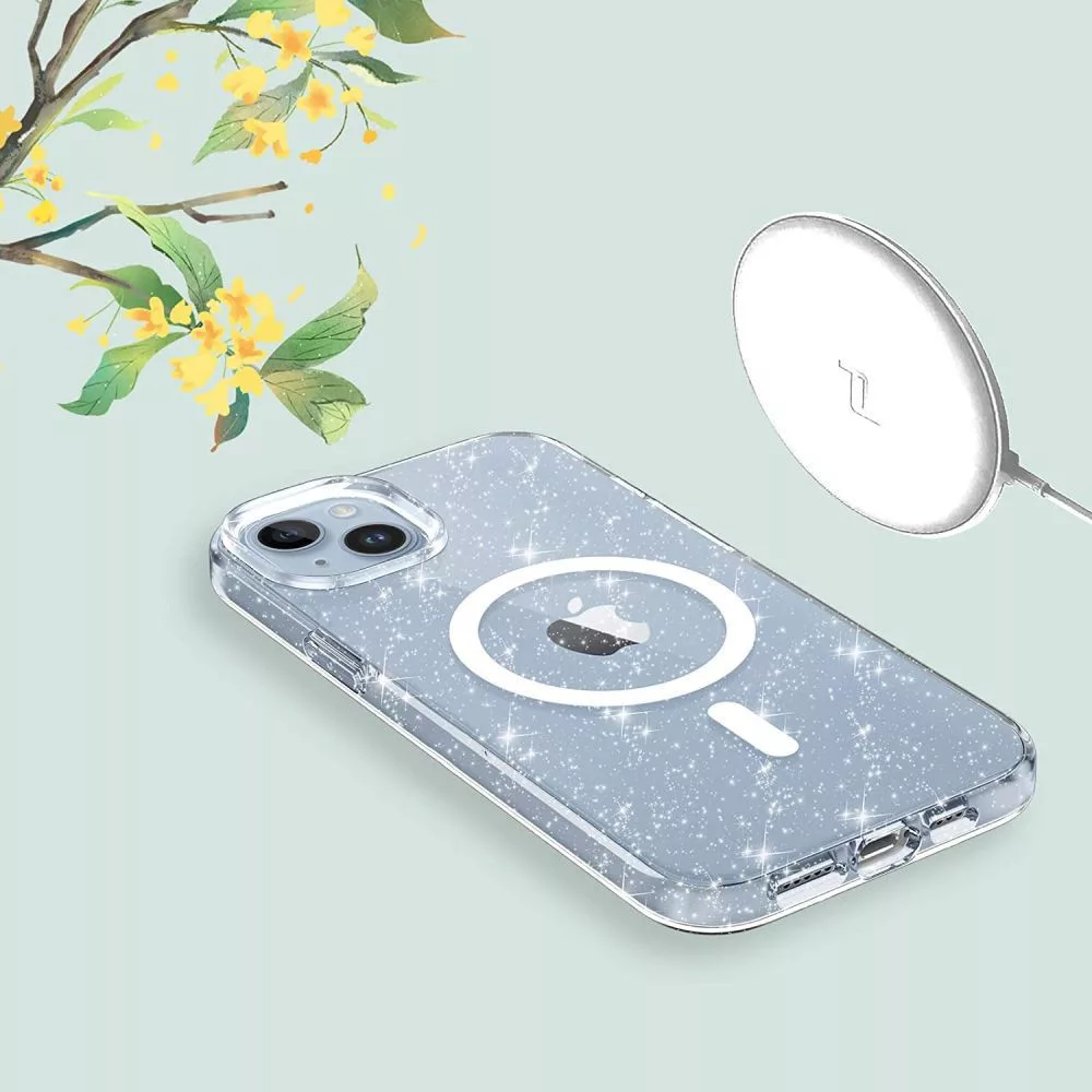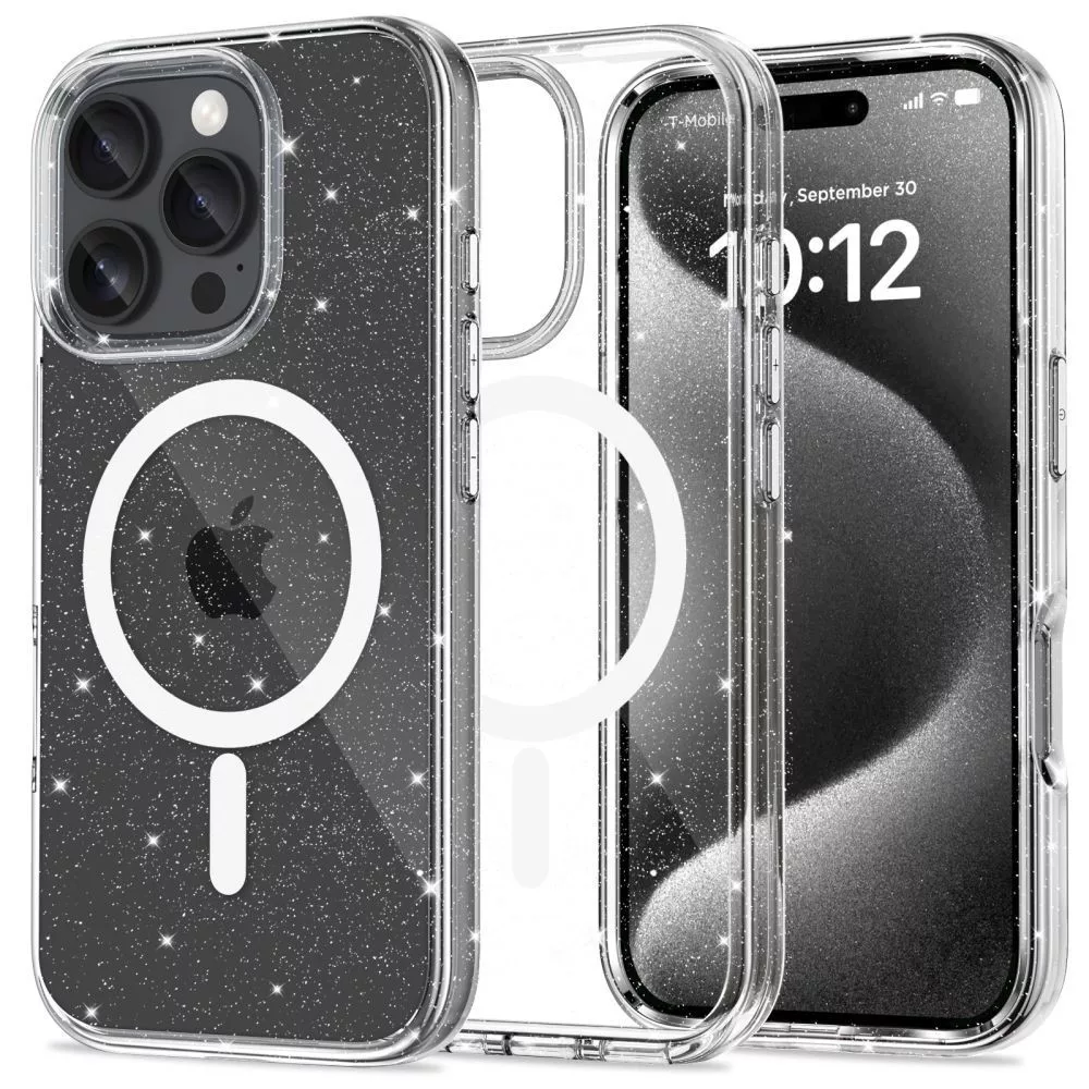 Apple iPhone 16 Pro Max, Műanyag hátlap védőtok + szilikon keret, Magsafe töltővel kompatibilis, csillogó hátlap, FlexAir Hybrid Magsafe Glitter, átlátszó