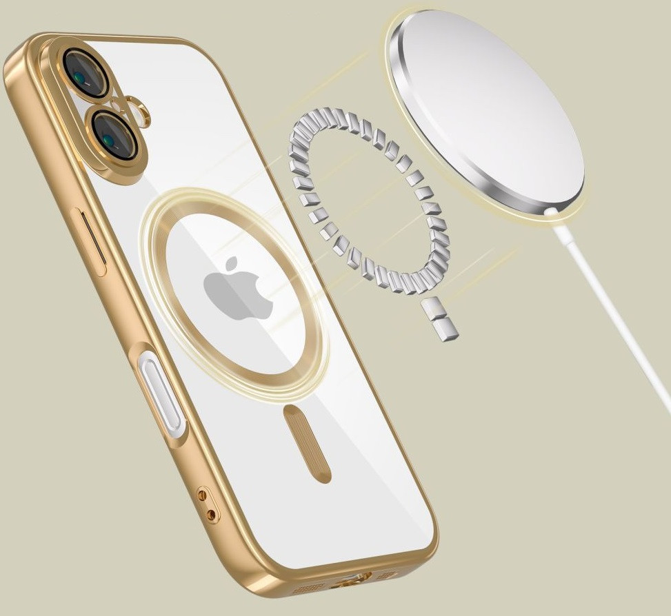 Apple iPhone 16e / 17e, Műanyag hátlap védőtok + szilikon keret, közepesen ütésálló, Magsafe töltővel kompatibilis, fényes keret, Magflex Magsafe, átlátszó/arany Apple iPhone 16e / 17e, Műanyag hátlap védőtok + szilikon keret, közepesen ütésálló, Magsafe töltővel kompatibilis, fényes keret, Magflex Magsafe, átlátszó/arany