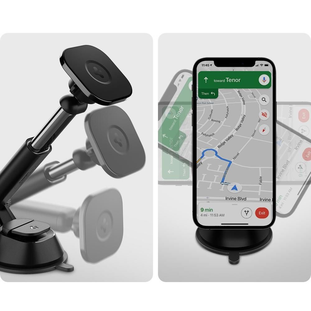 Autós tartó, Univerzális, műszerfalra rögzíthető, 360°-ban forgatható, mágneses, teleszkópos, Qi vezeték nélküli mágneses töltővel, 7.5W, Magsafe kompatibilis, Spigen OneTap Pro ITS35W, fekete