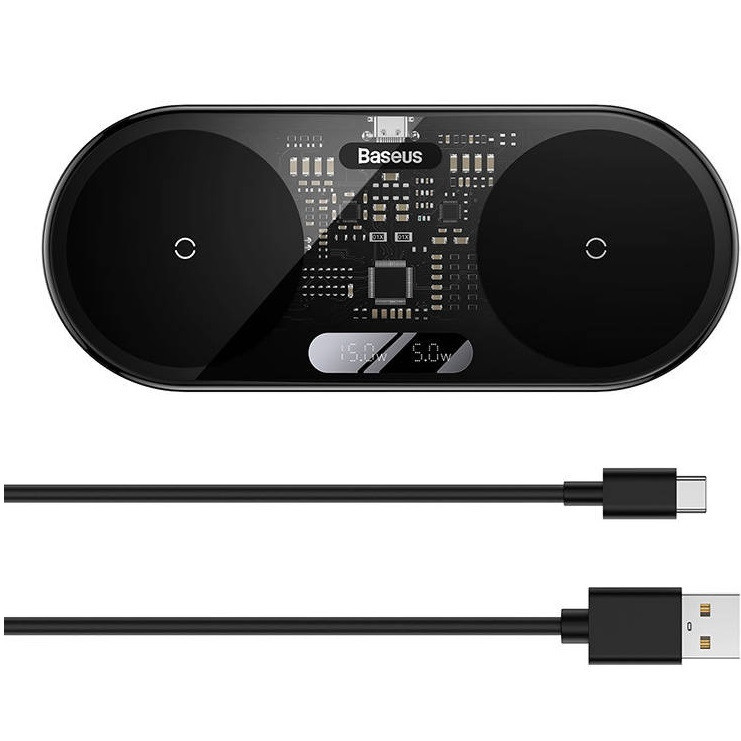 Baseus 2in1 vezeték nélküli töltő, digitális LED kijelzővel, Qi, USB-C-USB-A kábellel, 20W
