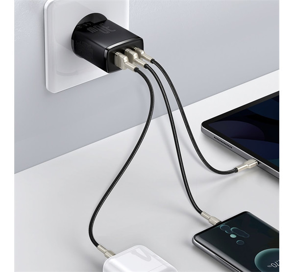 A Baseus Compact Charger egy 30W teljesítményű, gyors töltést biztosító adapter, amely kiváló választás otthoni, irodai és utazási használatra egyaránt. Két USB-A és egy USB-C porttal rendelkezik, így egyszerre akár három eszközt is tölthet.