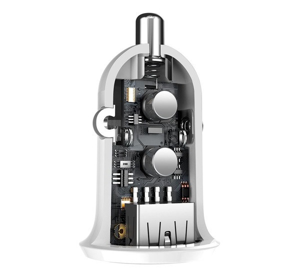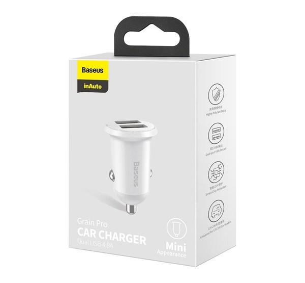 A Baseus Grain Pro autós töltő két USB porttal rendelkezik, amelyek összesen 4.8A kimeneti teljesítményt biztosítanak, lehetővé téve két eszköz egyidejű gyors töltését. A töltő intelligens iQ chippel van felszerelve, amely automatikusan felismeri a csatlakoztatott eszköz töltési igényeit, és megfelelően állítja be az áramot, így elkerülve a túltöltést és a túlmelegedést. Kompakt és diszkrét kialakításának köszönhetően könnyen illeszkedik a legtöbb autós töltő aljzatba.