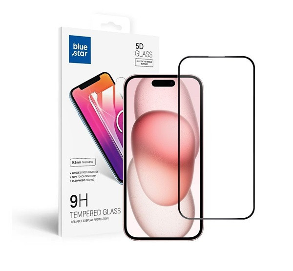 Blue Star Apple iPhone 15/ iPhone 16 5D teljes kijelzős tempered glass kijelzővédő üvegfólia, fekete