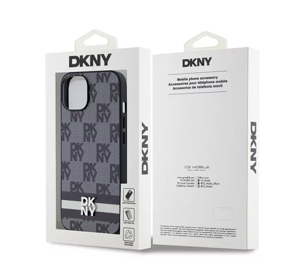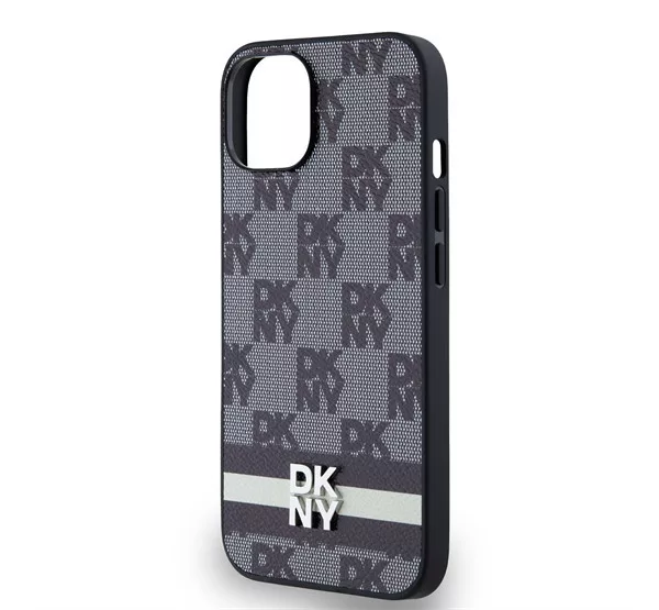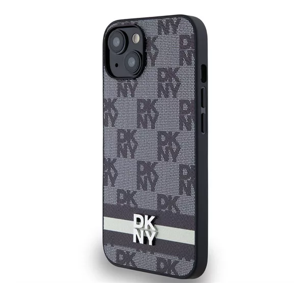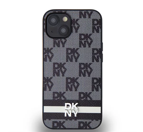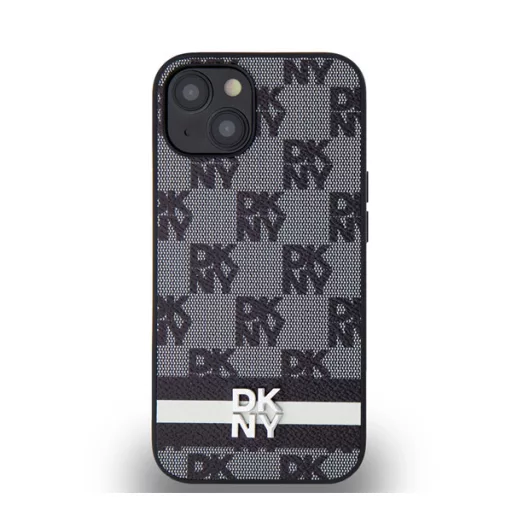 DKNY PU Leather Checkered Pattern and Stripe Apple iPhone 14 hátlap tok, fekete