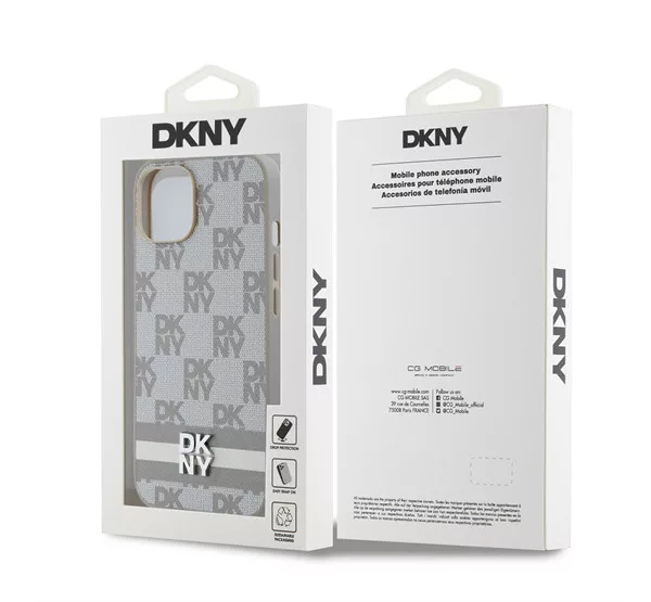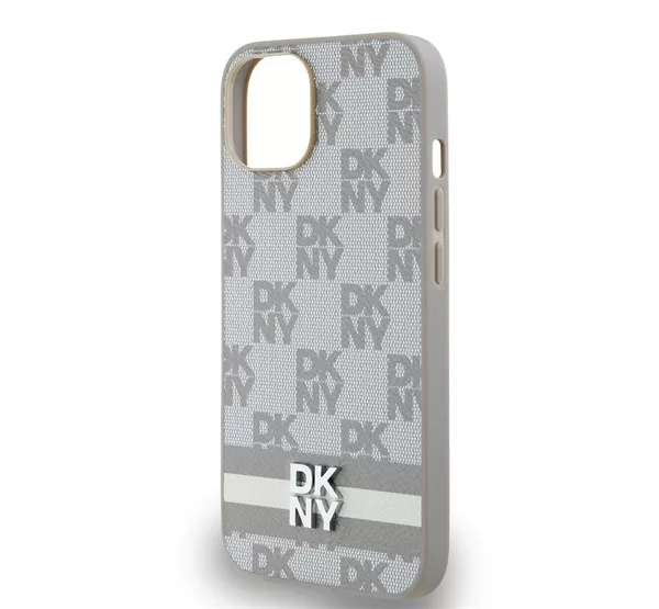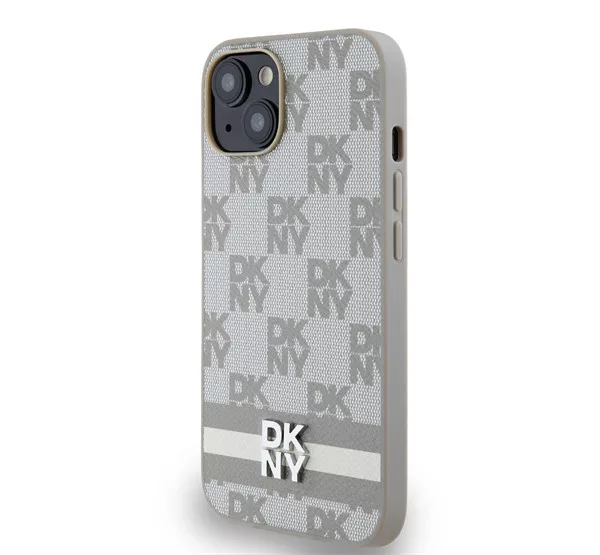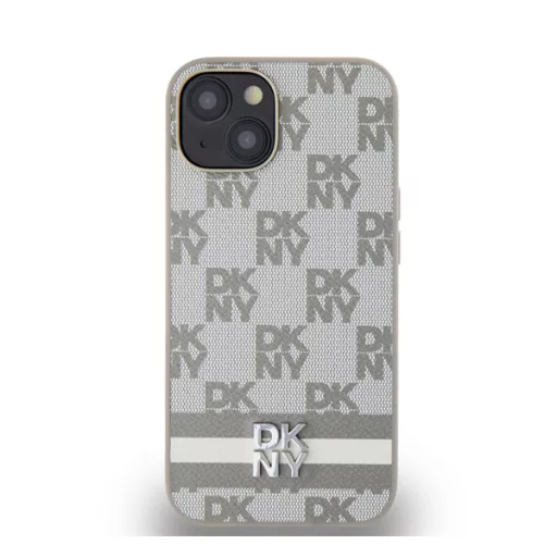 DKNY PU Leather Checkered Pattern and Stripe Apple iPhone 15 hátlap tok, bézs