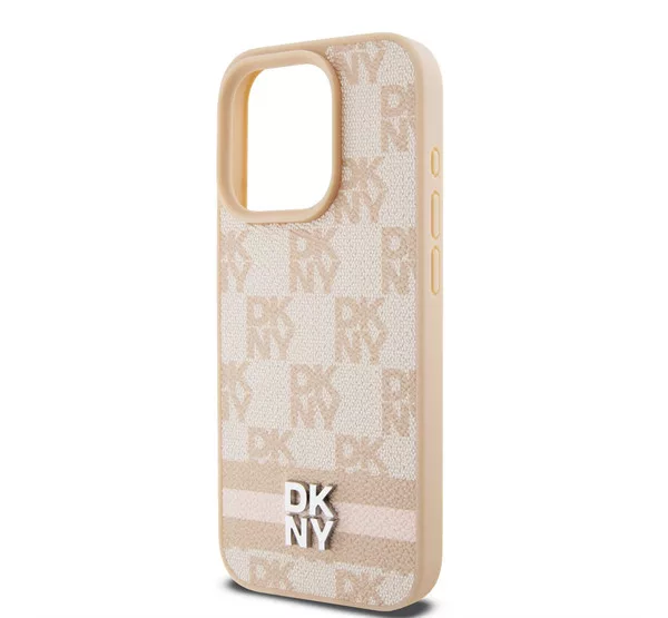 DKNY PU Leather Checkered Pattern and Stripe iPhone 13 Pro hátlap tok, rózsaszín