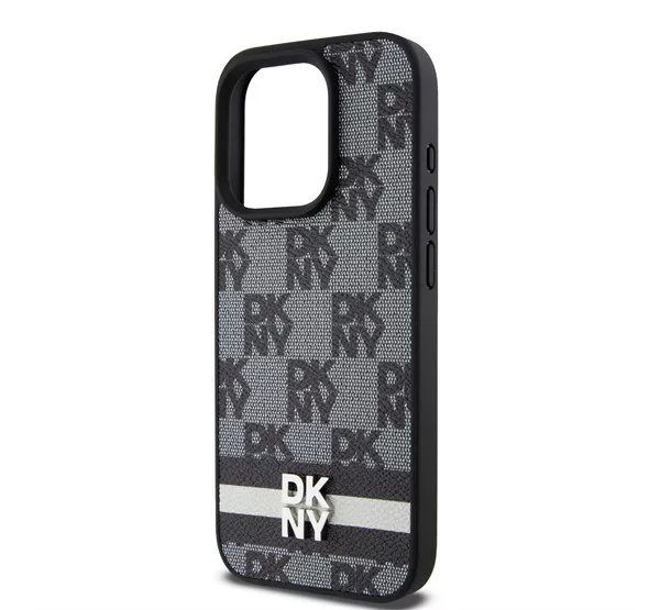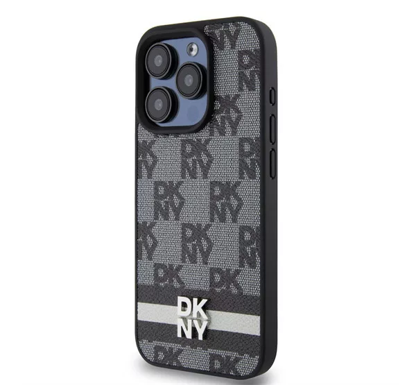 DKNY PU Leather Checkered Pattern and Stripe iPhone 15 Pro Max hátlap tok, fekete