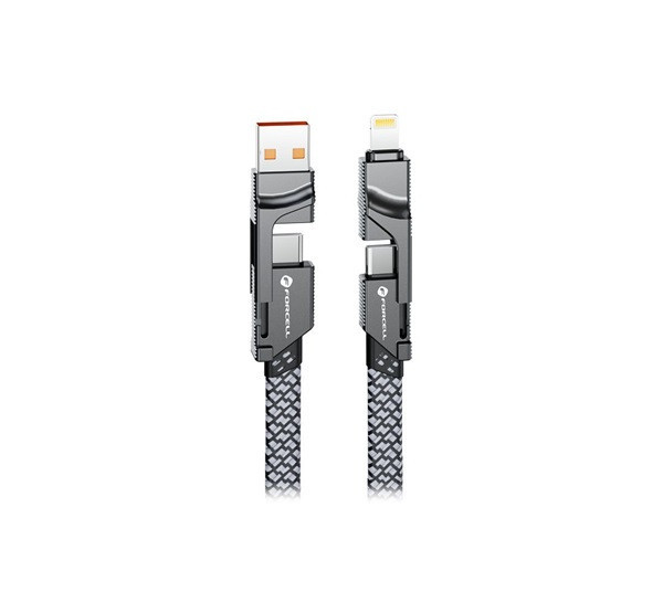 4 az 1-ben kábel A cserélhető csatlakozókkal ellátott innovatív kialakításának köszönhetően a Forcell kábel hatékony és sokoldalú töltést biztosít az eszközök széles skálájához. Akár USB-C, USB-A vagy Lightning csatlakozót használnak az eszközei, ez a kábel garantálja a teljes kompatibilitást.