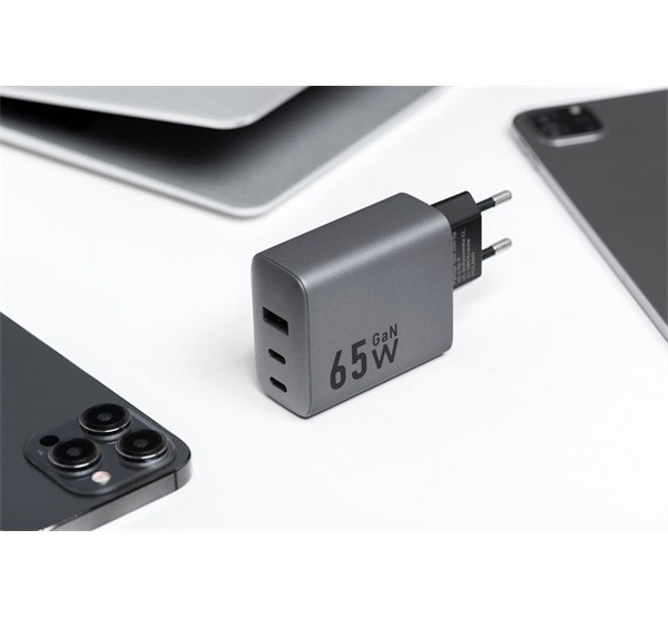 Három porttal rendelkező 65 W-os hálózati töltő: USB-C és 1x USB-A