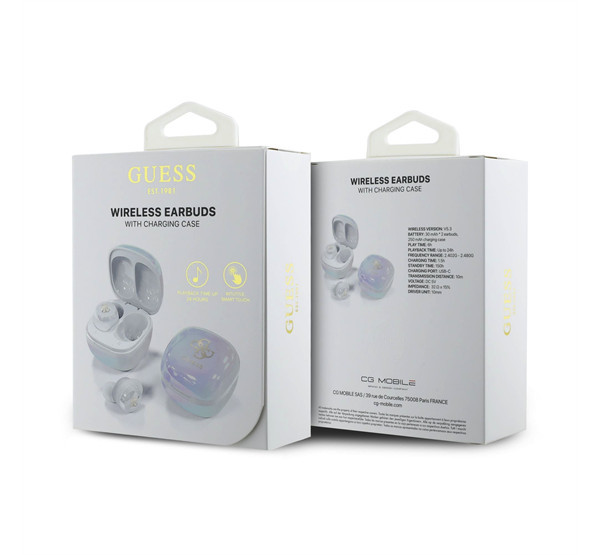A könnyű kialakítás és az ergonomikus forma hosszú ideig tartó viselés esetén is kényelmet biztosít. A Guess 4G Logo Mini TWS fülhallgató elegáns kialakítású, jellegzetes Guess logóval, ami modern és fényűző megjelenést kölcsönöz, amely bármilyen stílushoz jól illik.