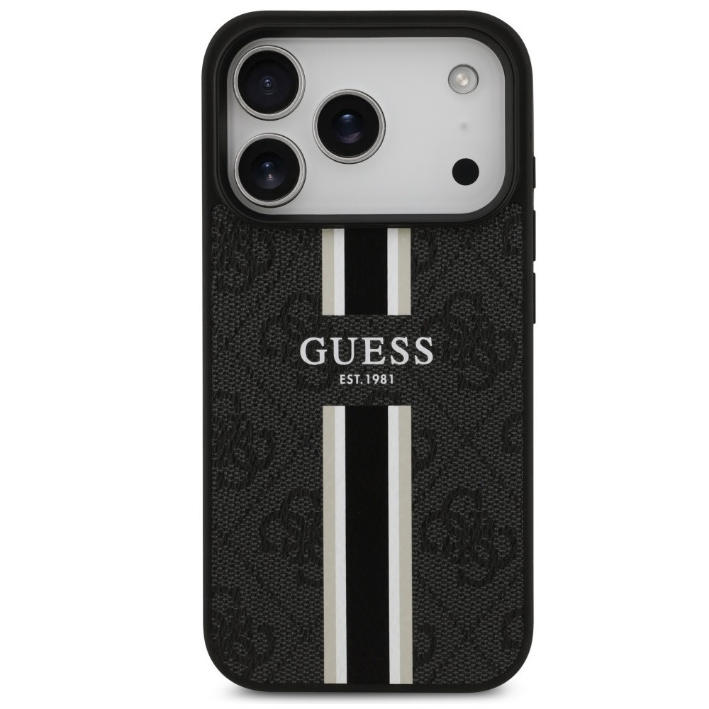 A tok középső részén a Guess logó és fehér csíkok találhatók, amelyek finoman hangsúlyozzák a tok presztízsét.