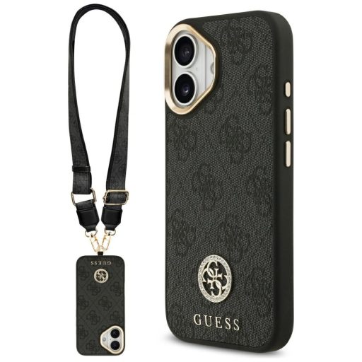 Guess 4G Strass Logo & Big Strap Metal Buttons Apple iPhone 17 hátlap tok univerzális pánttal, MagSafe, fekete-arany Guess 4G Strass Logo & Big Strap Metal Buttons Apple iPhone 17 hátlap tok univerzális pánttal, MagSafe, fekete-arany