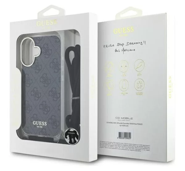 A kollekció egyediségét a kiváló minőségű 4G nyomtatás hangsúlyozza, amely páratlan stílusérzetet és eleganciát kölcsönöz. A grafikát vékony, átlátszó poliuretán réteggel borítják, így az ellenáll a kopásnak. A kifinomult kollekciót a tok alján található Guess arany logó teszi teljessé. A tokhoz ugyanilyen színű, állítható zsinór tartozik, amely nagyszerű kényelmet és komfortot biztosít a telefon használata során.