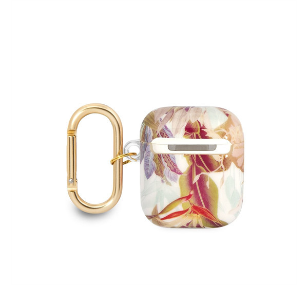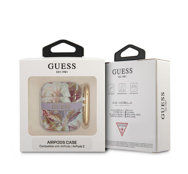 GUESS virágkollekció. A tok védi az Apple AirPods vezeték nélküli fejhallgató dokkolót a felületi sérülésektől és a töréstől. A tok hőre lágyuló poliuretánból készült, egyedi virágmotívummal. A kiváló minőségű burkolat tökéletesen illeszkedik az eredeti AirPods tokhoz, és rendkívül kellemes tapintású.