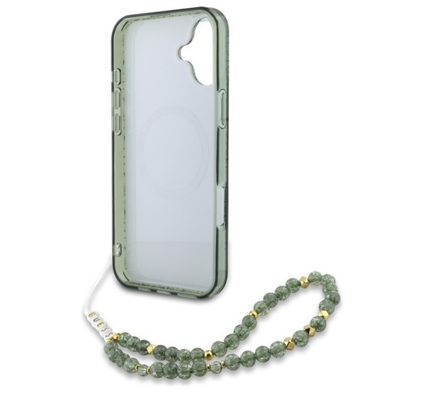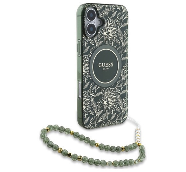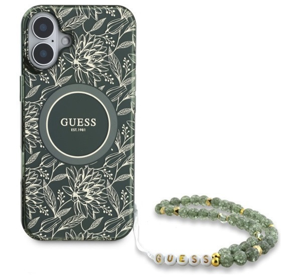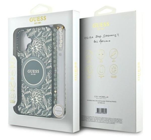 Ez az elegáns kollekció még a legigényesebb és legkifinomultabb ízlésűeket is lenyűgözi. A tok külső rétege finom aranyszínű virágmintával kápráztat el, amely eleganciát és előkelőséget kölcsönöz. A tok középpontja egy arany MagSafe gyűrű, amely körülöleli a stílusos GUESS logót, ami presztízst kölcsönöz és kiemeli az egyedi kialakítást. Az egészet egy ízléses gyöngyös kulcstartó egészíti ki, amely tökéletesen illeszkedik a tok színvilágához, a „GUESS” nevet formázó betűkkel, így ez a kiegészítő nem csak praktikus, hanem kivételesen divatos is.
