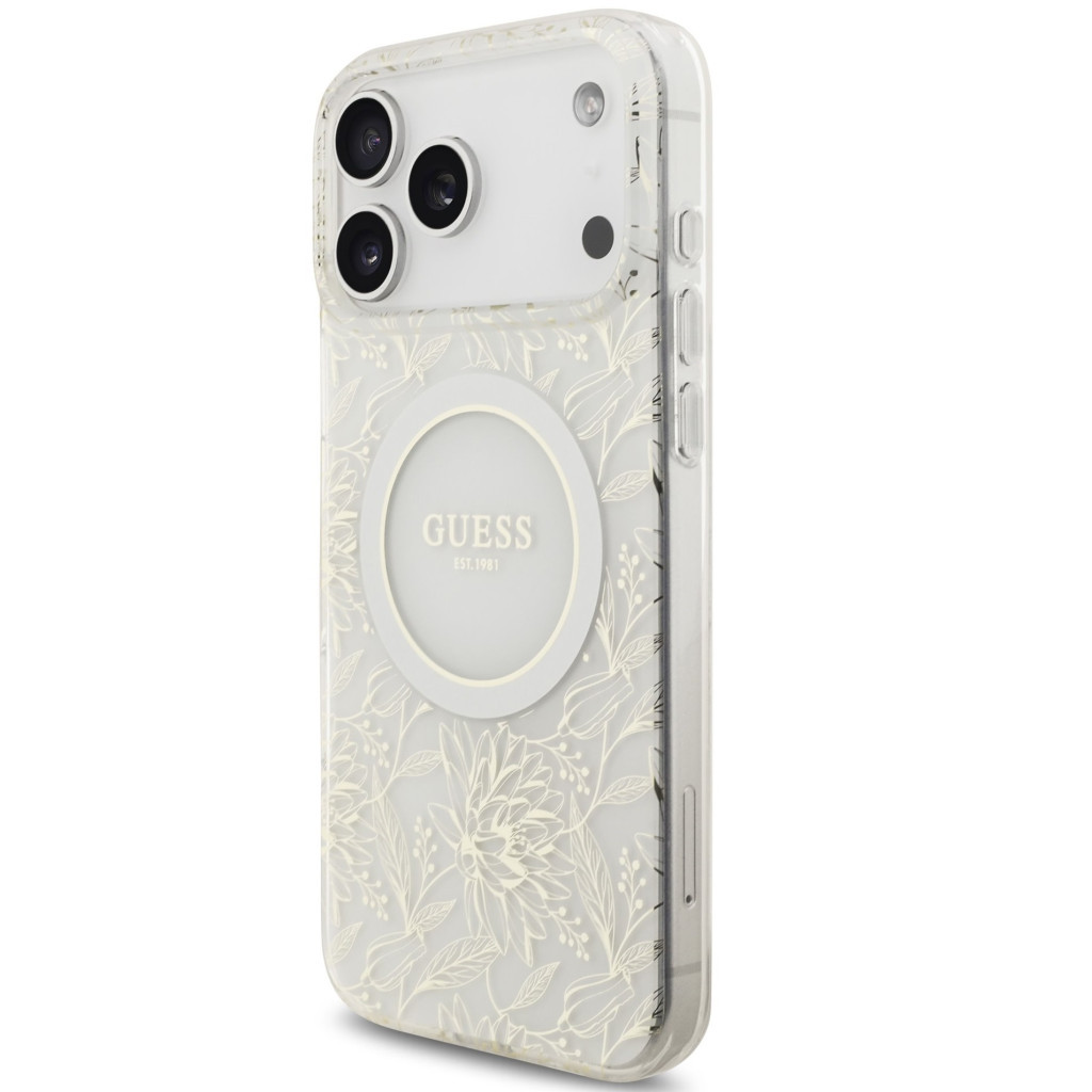 Guess IML Flowers Allover Strap Apple iPhone 17 Pro Max MagSafe hátlap tok karpánttal, fehér