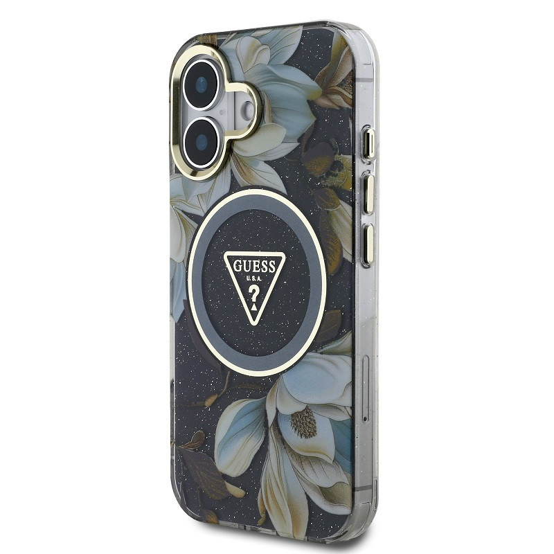 Guess IML Glitter Magnolia and Triangle Logo iPhone 16 MagSafe hátlap tok, fekete
