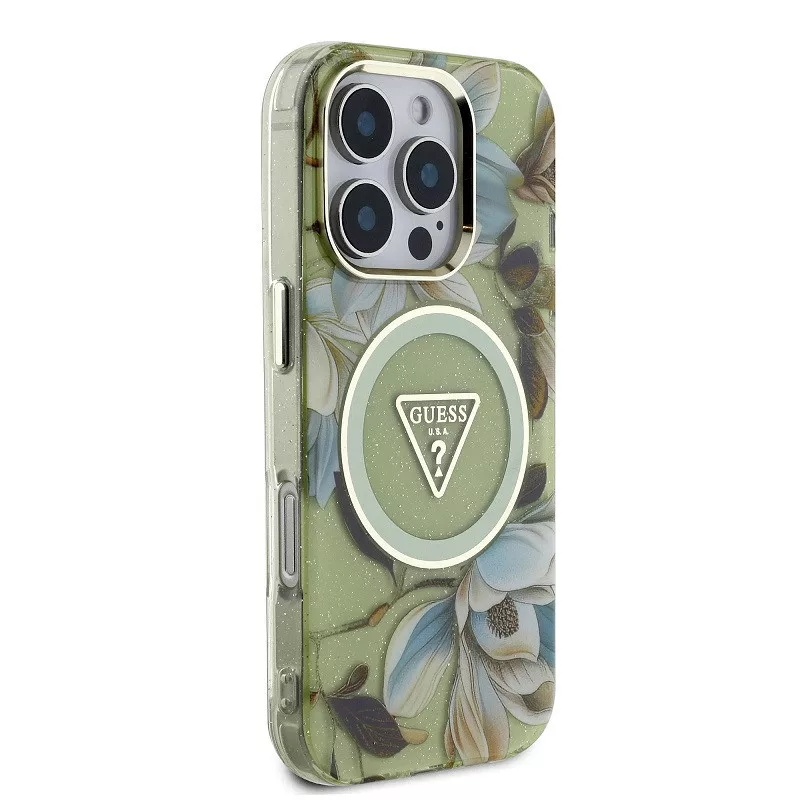 A csillogó alap nem csak kontrasztot ad, hanem kiemeli a magnólia virágok pasztell színeit és elegáns, minimalista megjelenést kölcsönöz a toknak.