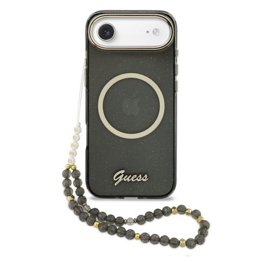 Guess IML Glitter Script Strap Apple iPhone Air (2025) csillámos hátlap tok karpánttal, MagSafe, fekete-arany Guess IML Glitter Script Strap Apple iPhone Air (2025) csillámos hátlap tok karpánttal, MagSafe, fekete-arany