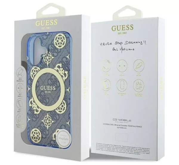 Ez az egyedi tok elegáns aranyszínű részletekkel hívja fel magára a figyelmet, köztük a márka jellegzetes emblémáival és a hozzá illő aranyszínű MagSafe gyűrűvel. A kiváló minőségű 4G nyomtatás, amely a Guess stílus ikonja, klasszikus, időtlen megjelenést kölcsönöz a toknak. Emellett a Guess logó finoman a mágneses gyűrű belsejében kapott helyet, tökéletesen kiegészítve az általános dizájnt.