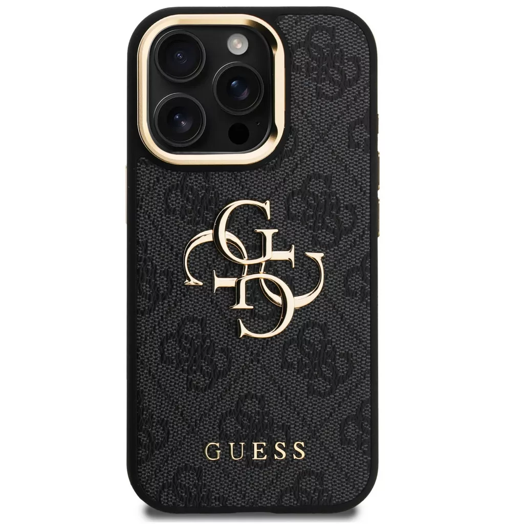 Guess PU 4G Metal Logo Apple iPhone 15 Pro Max hátlap tok kitámasztható kamera peremmel, fekete-arany