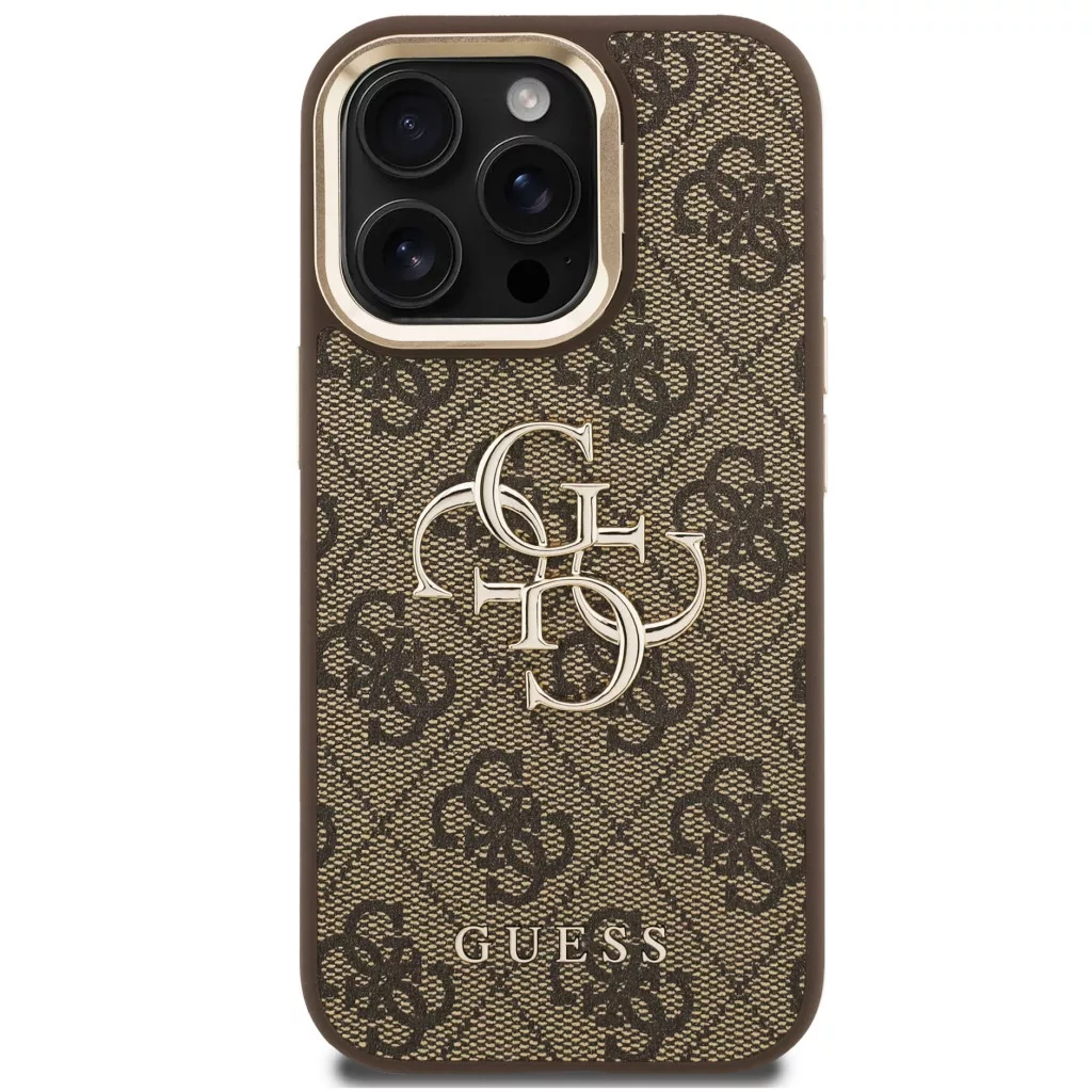 Guess PU 4G Metal Logo Apple iPhone 16 Pro hátlap tok kitámasztható kamera peremmel, barna-arany