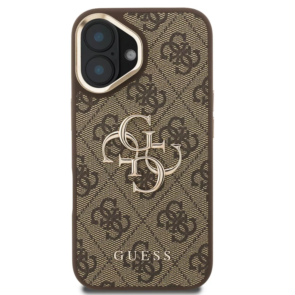 Guess PU 4G Metal Logo Apple iPhone 16 hátlap tok kitámasztható kamera peremmel, barna-arany