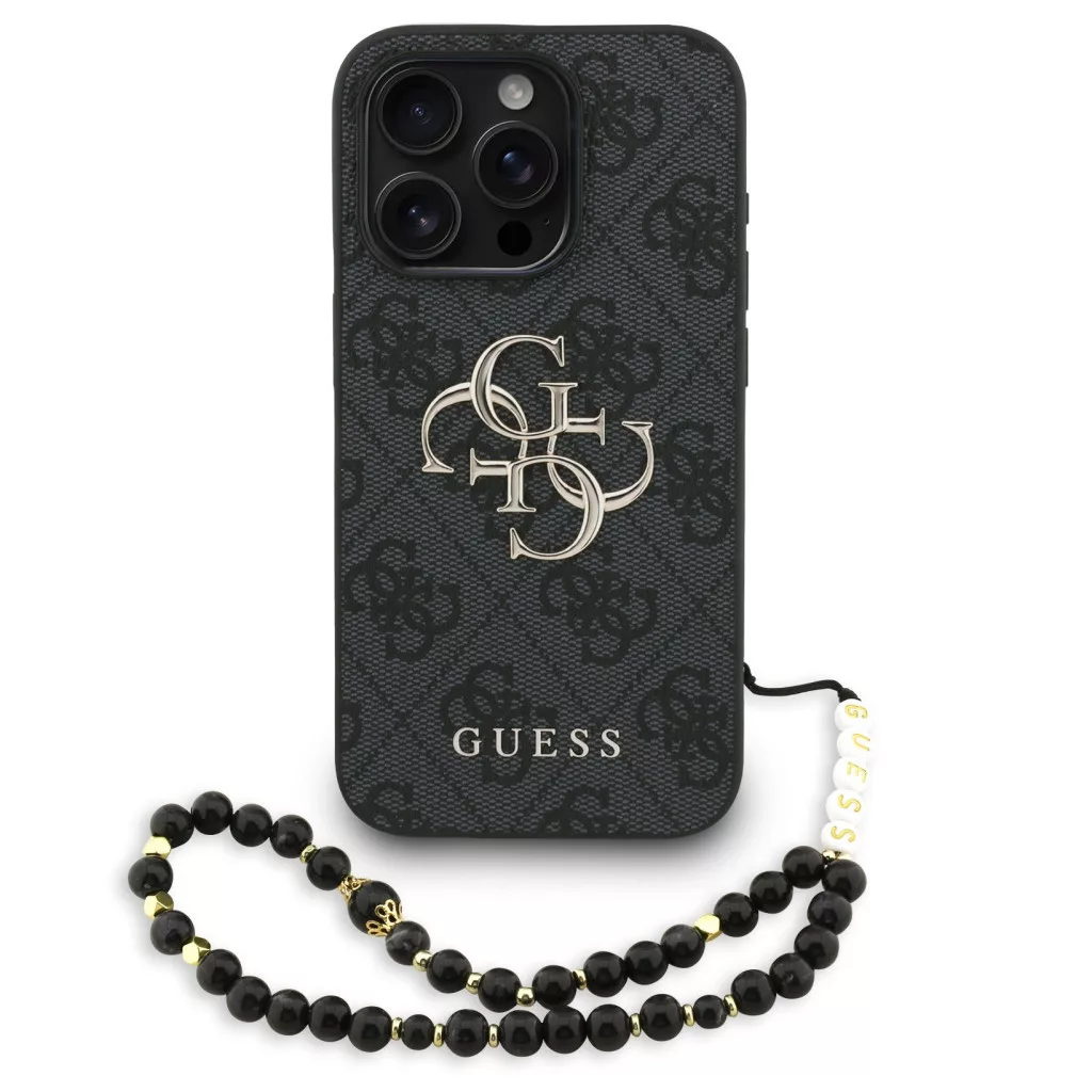 Guess PU 4G Metal Logo Strap Apple iPhone 15 Pro Max hátlap tok fekete színű karpánttal, fekete-arany