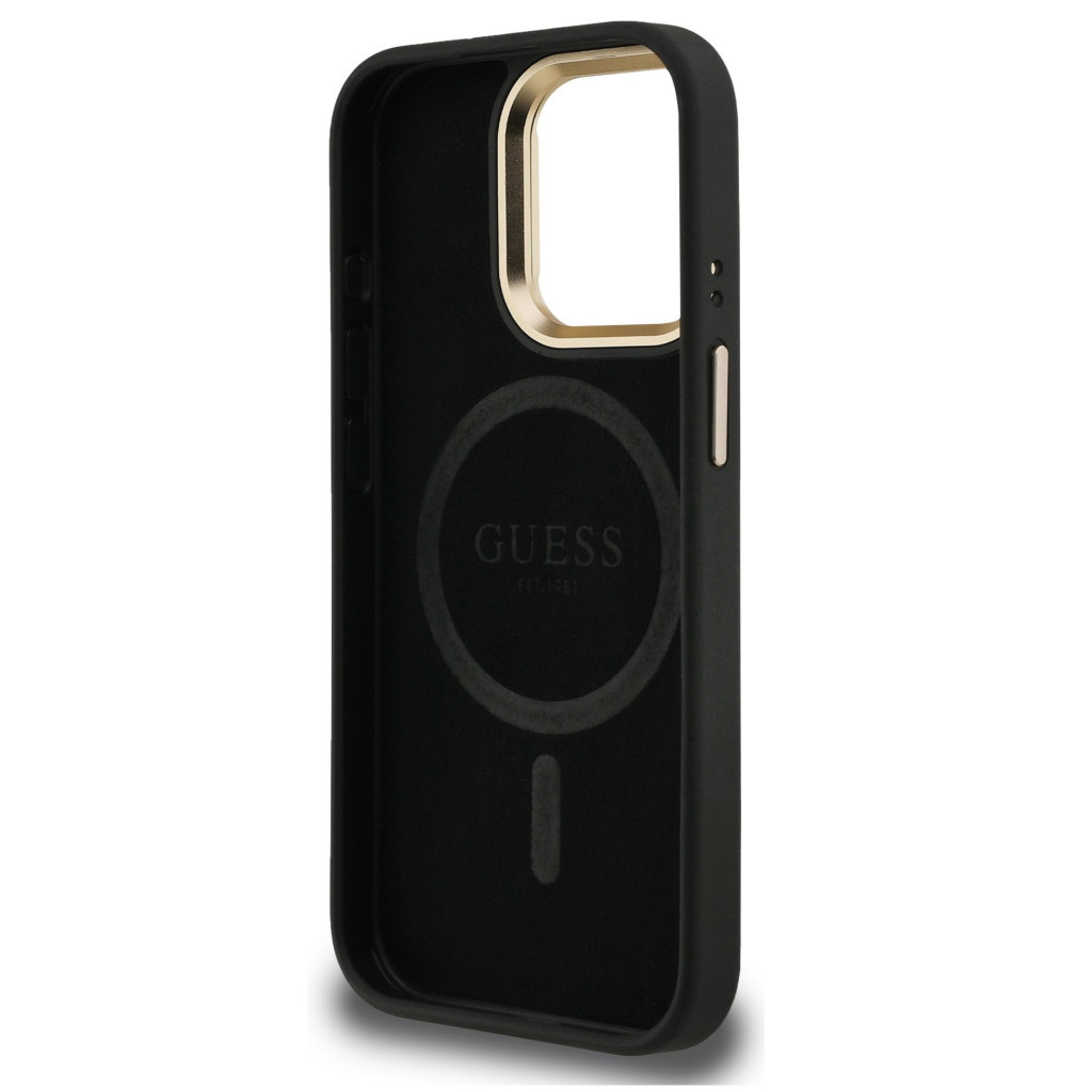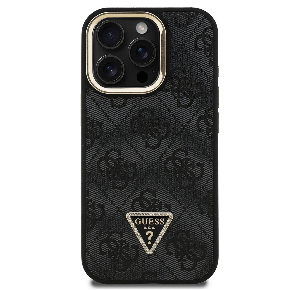 Guess PU 4G Strass Triangle Logo Apple iPhone 16 Pro MagSafe tok kitámasztható kamera peremmel, fekete-arany Guess PU 4G Strass Triangle Logo Apple iPhone 16 Pro MagSafe tok kitámasztható kamera peremmel, fekete-arany