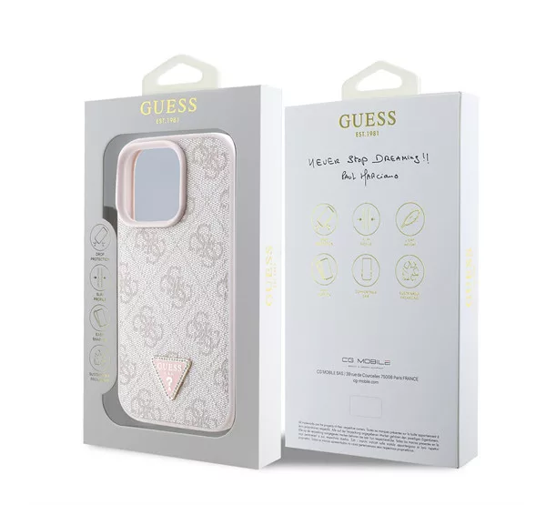 A prémium Guess PU 4G Strass háromszög fém logóval ellátott hátlap elegáns, jellegzetes 4G mintával és arany háromszög GUESS logóval rendelkezik.