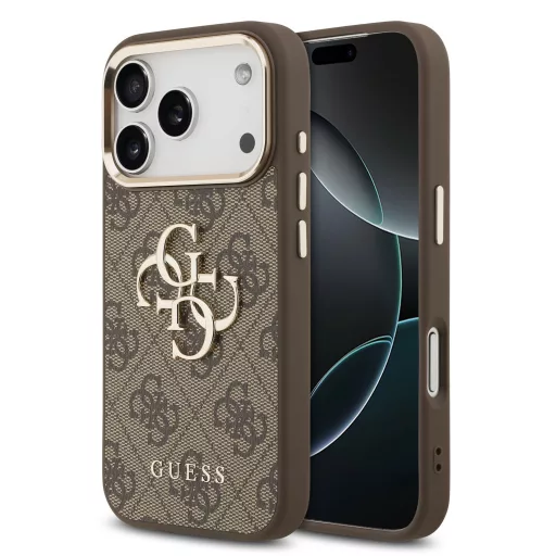 Guess PU Leather 4G Metal Logo Gold Frame Apple iPhone 17 Pro hátlap tok, barna