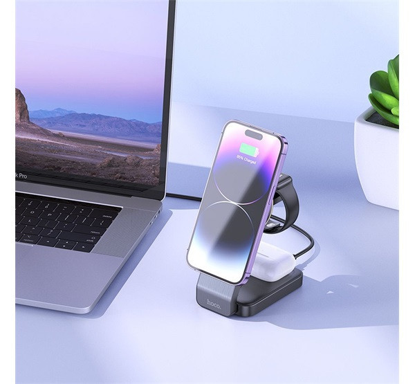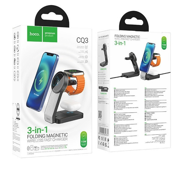 A Hoco CQ3 3in1 vezeték nélküli töltő egy prémium megoldás, amely lehetővé teszi, hogy egyszerre töltsd iPhone-odat, Apple Watch-odat és AirPods-odat. A MagSafe kompatibilitásnak köszönhetően a töltés gyors és stabil, az erős mágneses kapcsolat biztosítja, hogy a telefonod mindig a helyén maradjon. A 15W-os töltési teljesítmény gyors és hatékony töltést kínál minden eszköz számára. A 3 az 1-ben kialakítás segít rendet tartani az íróasztalon vagy éjjeliszekrényen, miközben egyetlen eszközzel több eszközödet is töltheted egyszerre. A modern, fekete dizájn stílusosan illeszkedik bármilyen környezetbe, legyen szó otthonról vagy irodáról.