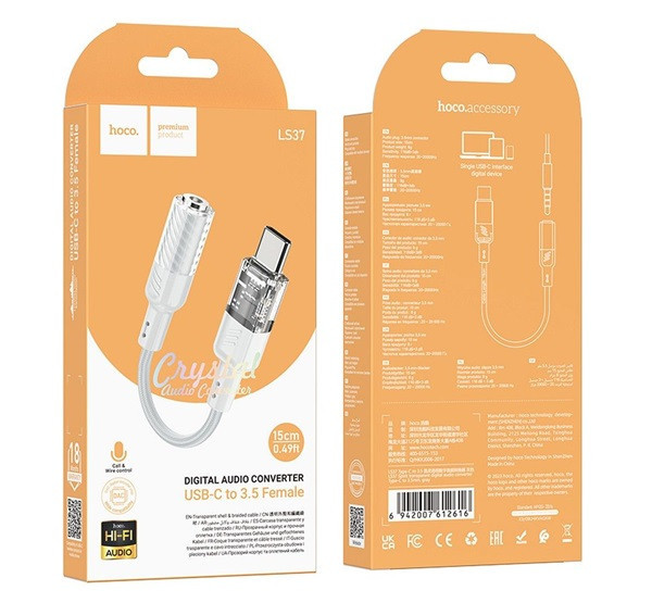 A Hoco LS37 Type-C - 3,5mm Jack adapter egy praktikus megoldás, amely lehetővé teszi, hogy Type-C csatlakozós eszközeiddel is használhasd a 3,5mm-es jack csatlakozóval rendelkező fülhallgatókat vagy hangszórókat. A fehér színű adapter kétkomponensű műanyagból készült, tartós, mégis elegáns kialakítású. Beépített DAC dekódoló chipje biztosítja a kiváló hangminőséget, és támogatja a mikrofont és a vezetékes vezérlést is, így a zenehallgatás és a hívások kezelése is egyszerű és kényelmes. A frekvenciaátvitel 20 – 20000Hz, a szenzitivitása pedig 116dB ± 3dB, ami részletgazdag és tiszta hangzást eredményez. Kompakt méretével és könnyű, mindössze 10,2g súlyával, ez az adapter ideális választás a mindennapi használatra.