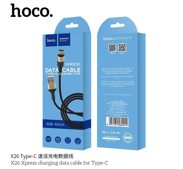 The Hoco X26 Xpress USB to Type-C töltő- és adatkábel egy 1 méter hosszú, fekete-arany színű, nylon fonott kábel, amelyet gyors töltésre és adatátvitelre terveztek. Ez a kábel támogatja a maximum 2A töltőáramot, és akár 9V 2A gyors töltést is lehetővé tesz, így hatékonyan tölti az Android és Type-C portos eszközöket. A tartós kialakítást az alumíniumötvözet csatlakozó és a TPE injektált forma biztosítja, ami minimalizálja a sérüléseket és meghosszabbítja a kábel élettartamát