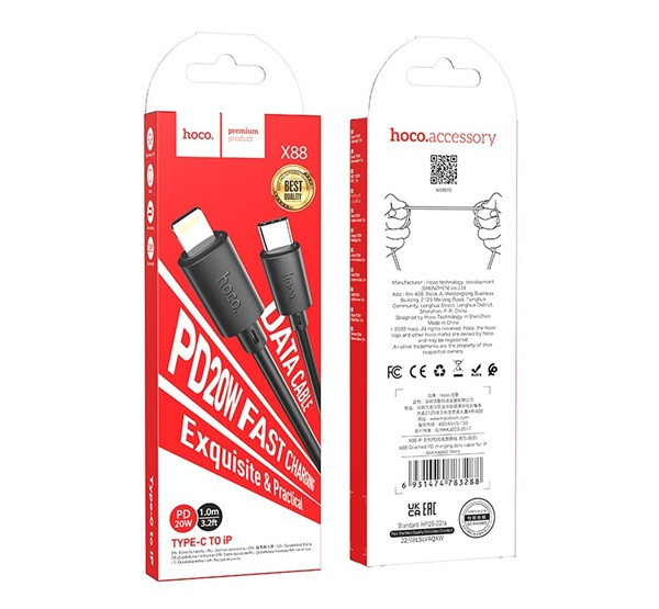 A Hoco X88 Gratified Type-C / Lightning töltő- és adatkábel egy 1 méter hosszú kábel, amely 20W teljesítményű gyorstöltést biztosít Power Delivery (PD) és Quick Charge (QC) támogatással. Kifejezetten olyan eszközökhöz készült, amelyek Lightning és Type-C csatlakozókkal rendelkeznek. A kábel strapabíró fém csatlakozókkal van ellátva, és maximális töltési áramerőssége 2400mA. Ezen kívül adatátvitelre is alkalmas, akár 480 Mbps sebességgel. Ideális választás mindennapi használatra, különösen iPhone és más Apple eszközök gyors töltésére