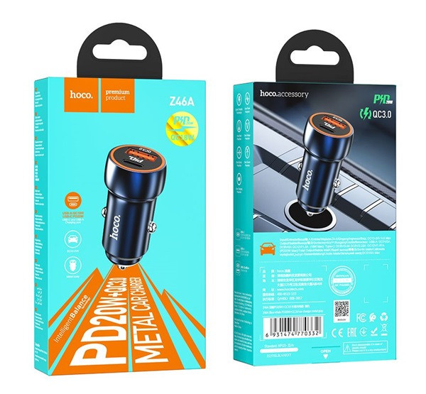 A Hoco Z46A autós szivargyújtó töltő két csatlakozóval rendelkezik: egy Type-C és egy USB QC3.0 porttal, összesen 20W teljesítménnyel. A Type-C port támogatja a Power Delivery (PD) gyorstöltést, míg a USB port kompatibilis a Quick Charge 3.0 technológiával. Ez a töltő ideális megoldás különböző eszközök, például okostelefonok és táblagépek gyors töltésére az autóban. Kompakt kialakításának köszönhetően könnyen használható és tárolható bármilyen járműben