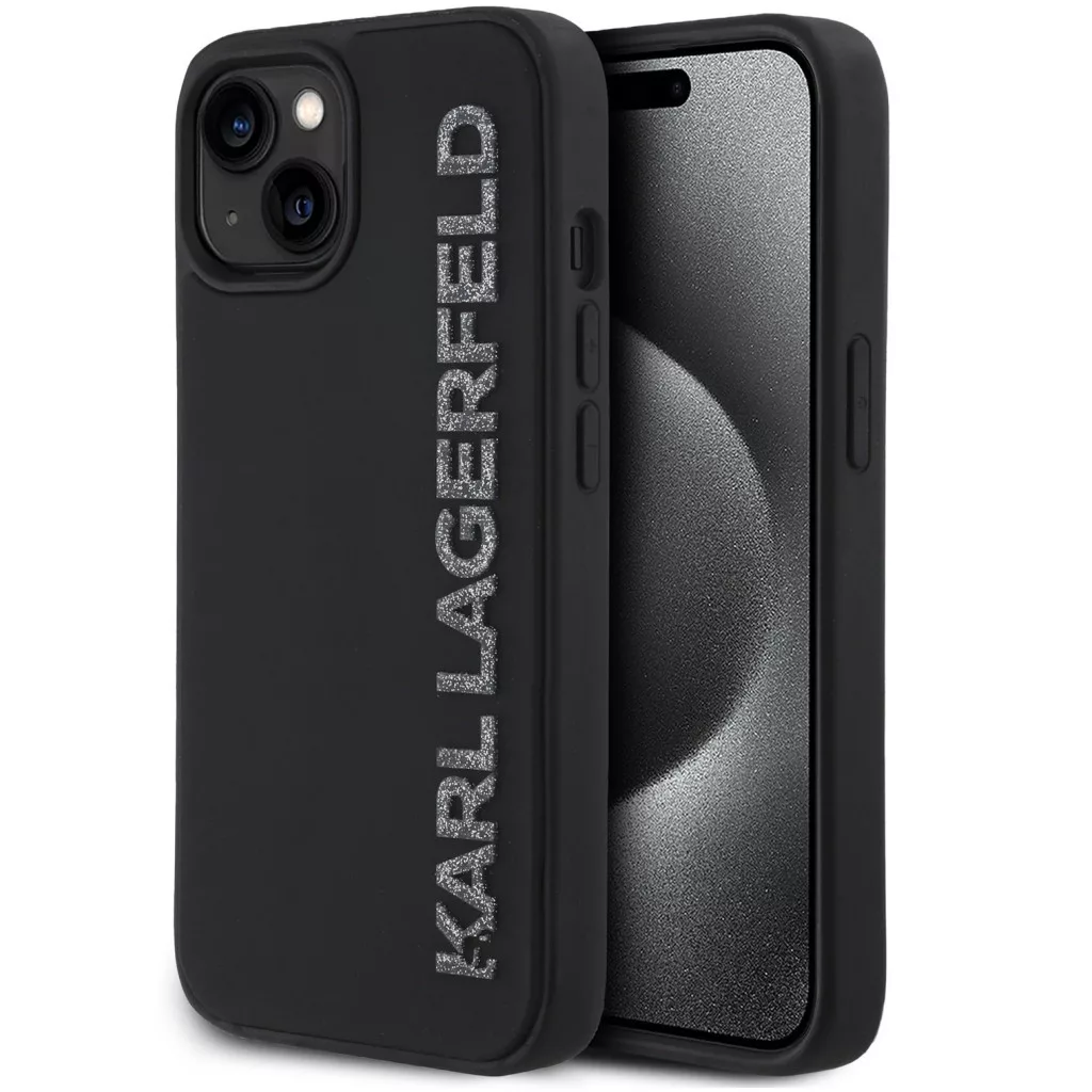 Karl Lagerfeld 3D Rubber Glitter Logo iPhone 14 csillámos hátlap tok, fekete