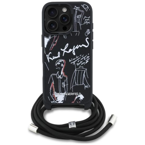 Karl Lagerfeld Crossbody Grained Pattern & Logo iPhone 16 Pro műbőr hátlap tok vállpánttal, MagSafe, fekete