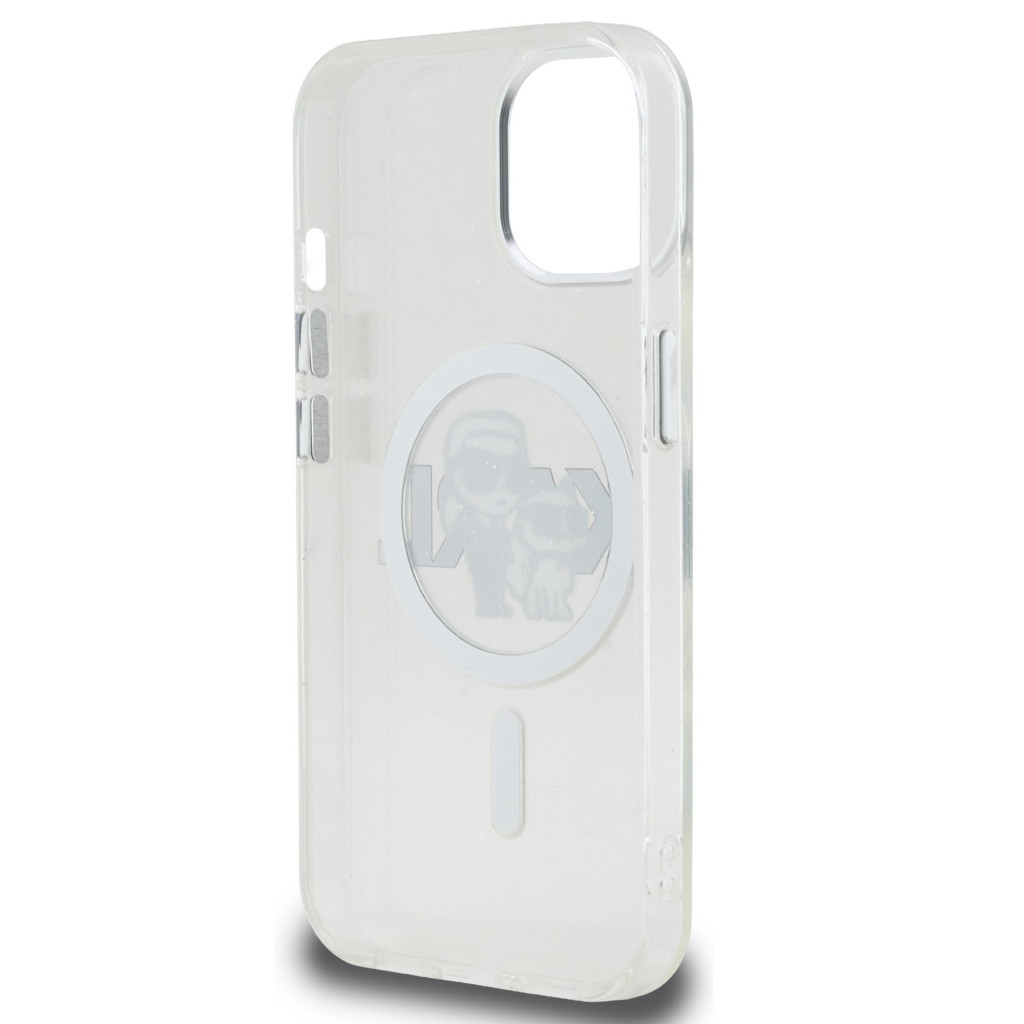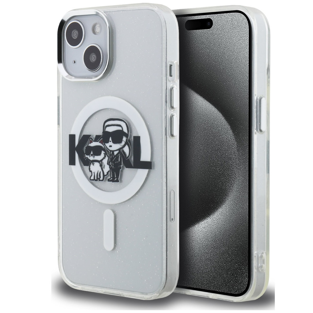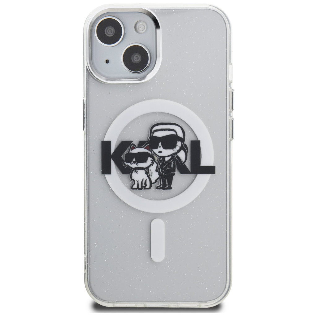 Karl Lagerfeld IML Glitter Karl and Choupette Sketch iPhone 15 MagSafe kompatibilis hátlap tok, átlátszó