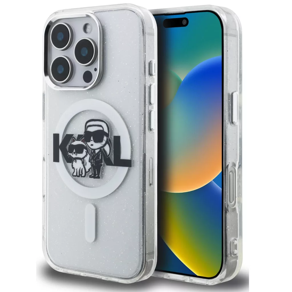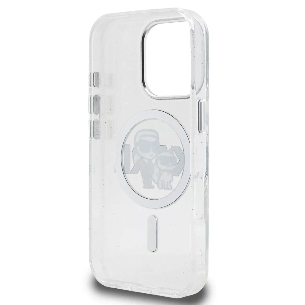 Karl Lagerfeld IML Glitter Karl and Choupette Sketch iPhone 15 Pro MagSafe kompatibilis hátlap tok, átlátszó